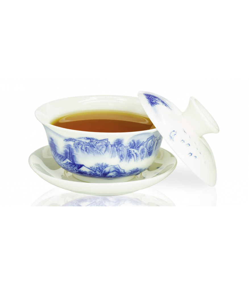 Blue landscape painted porcelain bowl with matching lid for brewing and drinking Tea in a traditional Chinese method. Perfect for a Gong Fu ceremony. Normally used for oolong, green and white teas.